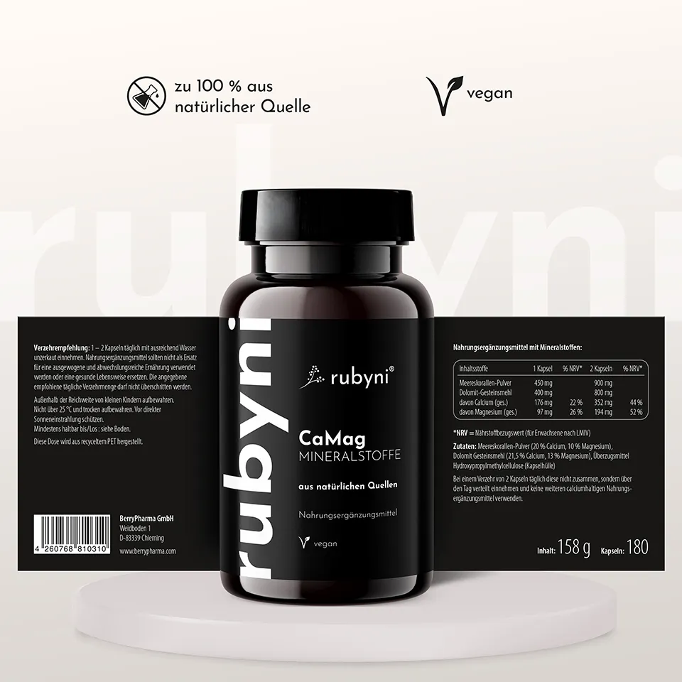 One capsule of rubyni® CaMag MINERALS contains 450 milligrams of sea coral powder and 400 milligrams of dolomite rock flour. This contains 176 milligrams of calcium (22 % according to NRV*) and 97 milligrams of magnesium (26 % according to NRV*).