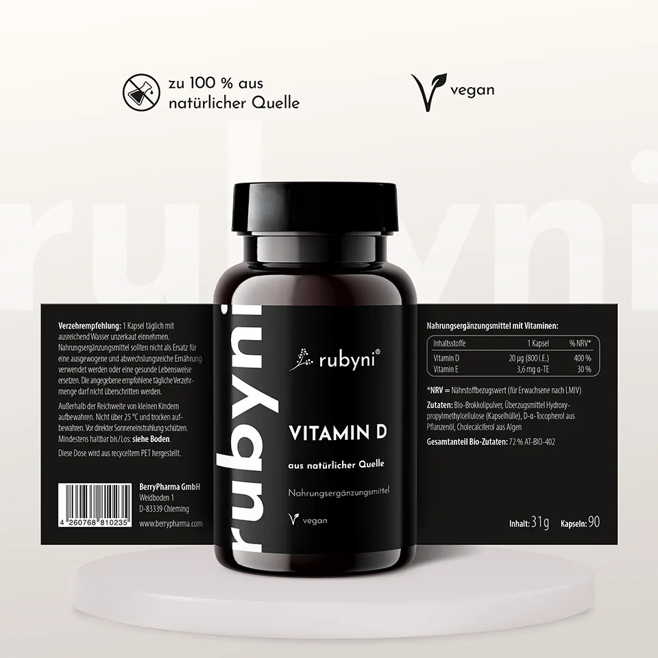 rubyni® Vitamin D can help you to cover your daily requirement of the vital substance from a natural and purely plant-based source. We obtain our vitamin D from selected algae and ensure the highest quality through careful processing. Our capsules contain the vitamin in the form of vitamin D3 (cholecalciferol). The body can easily absorb this form and utilize it directly. Absorption is supported by the other high-quality ingredients: vitamin E and organic broccoli powder.