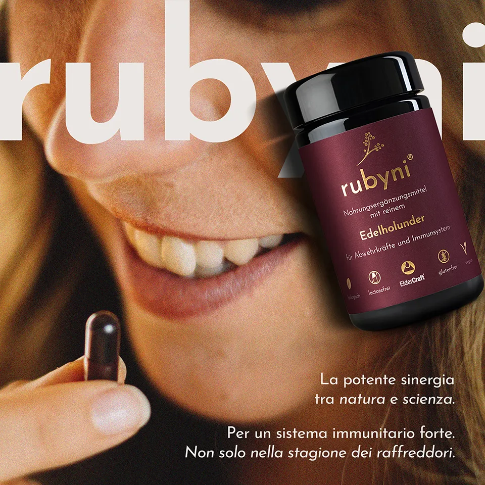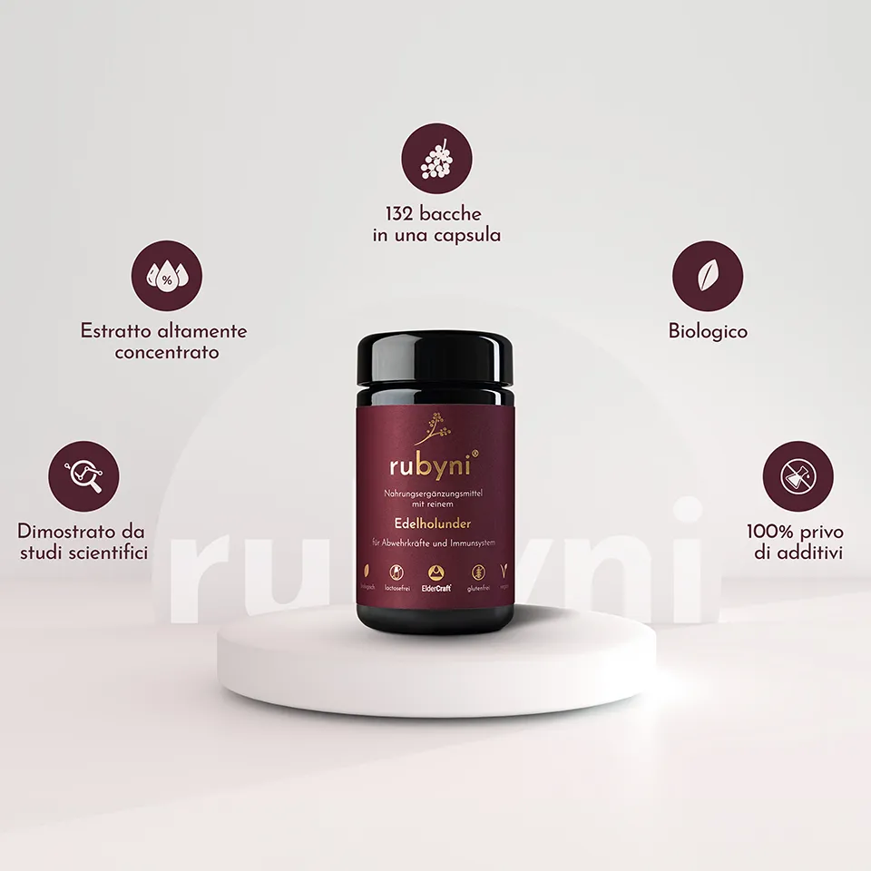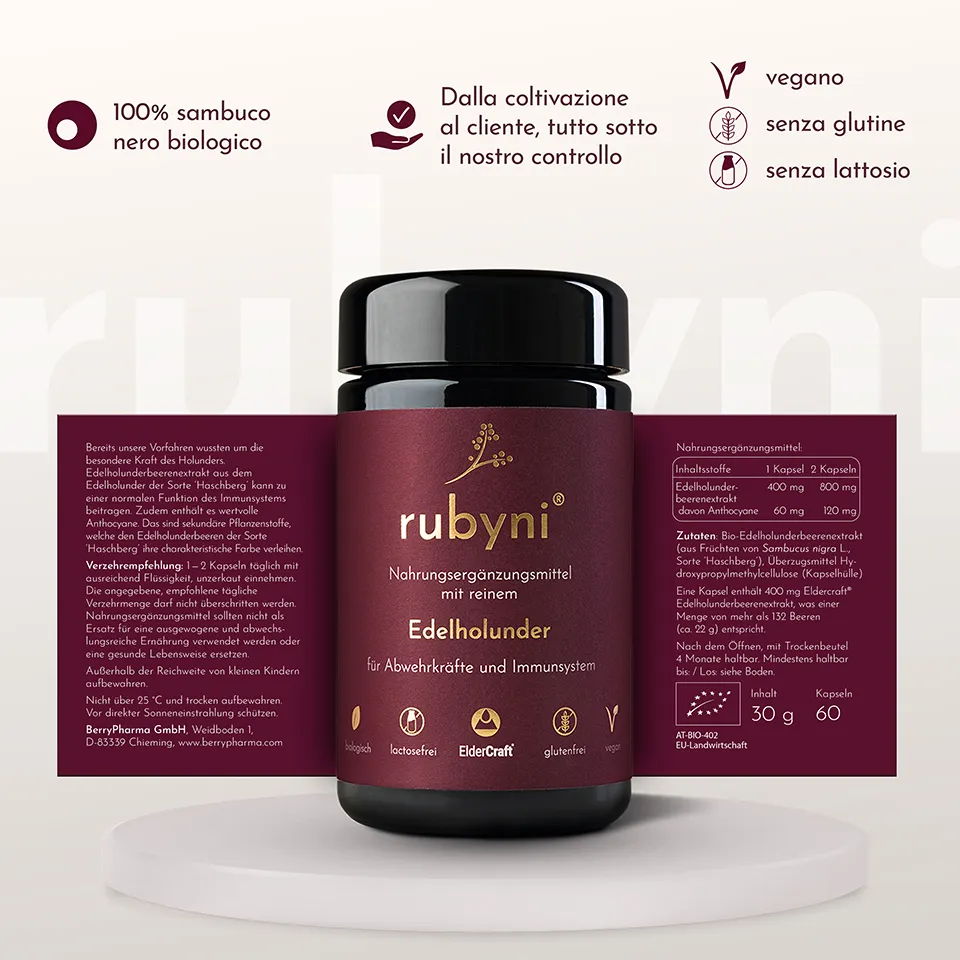 Il sistema immunitario svolge tutta una serie di compiti importanti per il nostro organismo. L’alimentazione sana e consapevole è un valido supporto per assecondarlo. Bastano 1-2 capsule di sambuco rubyni® al giorno per integrare la tua dieta. Il sambuco rubyni® contiene il 100% di ElderCraft®, un estratto secco altamente concentrato e di alta qualità di bacche di sambuco nero. Una sola capsula contiene l’energia di almeno 132 bacche. rubyni® sambuco è un prodotto biologico puro senza riempitivi ed è prodotto con estrema cura dalle bacche di sambuco della varietà Haschberg utilizzando un metodo speciale e unico di ultrafiltrazione senza solventi o additivi chimici. rubyni® sambuco puro in capsule, non contiene altre vitamine o simili, perché solo ciò che è puro può sviluppare tutta la sua forza e il suo effetto.