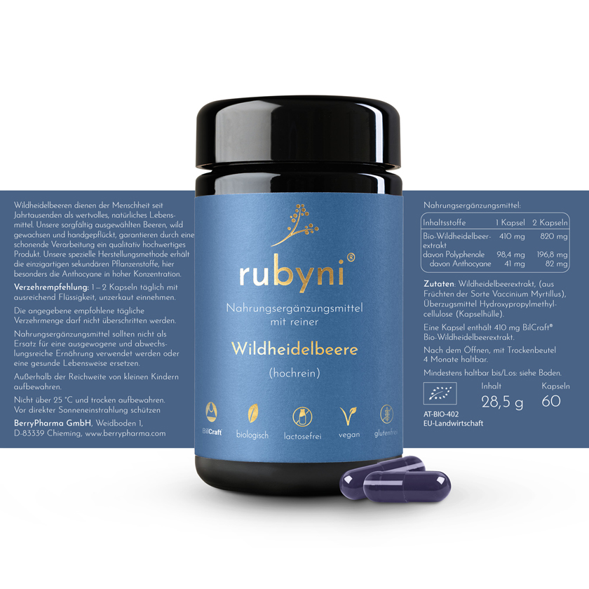 Zutaten: Eine Kapsel enthält 410 mg Wildheidelbeerextrakt der Sorte Vaccinium Myrtillus, davon Polyphenole 98,4 mg und 41 mg Anthocyane. Überzugsmittel: Hydroxypropylmethylcellulose (pflanzenbasierte Kapselhülle)