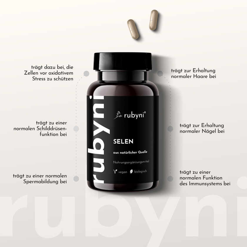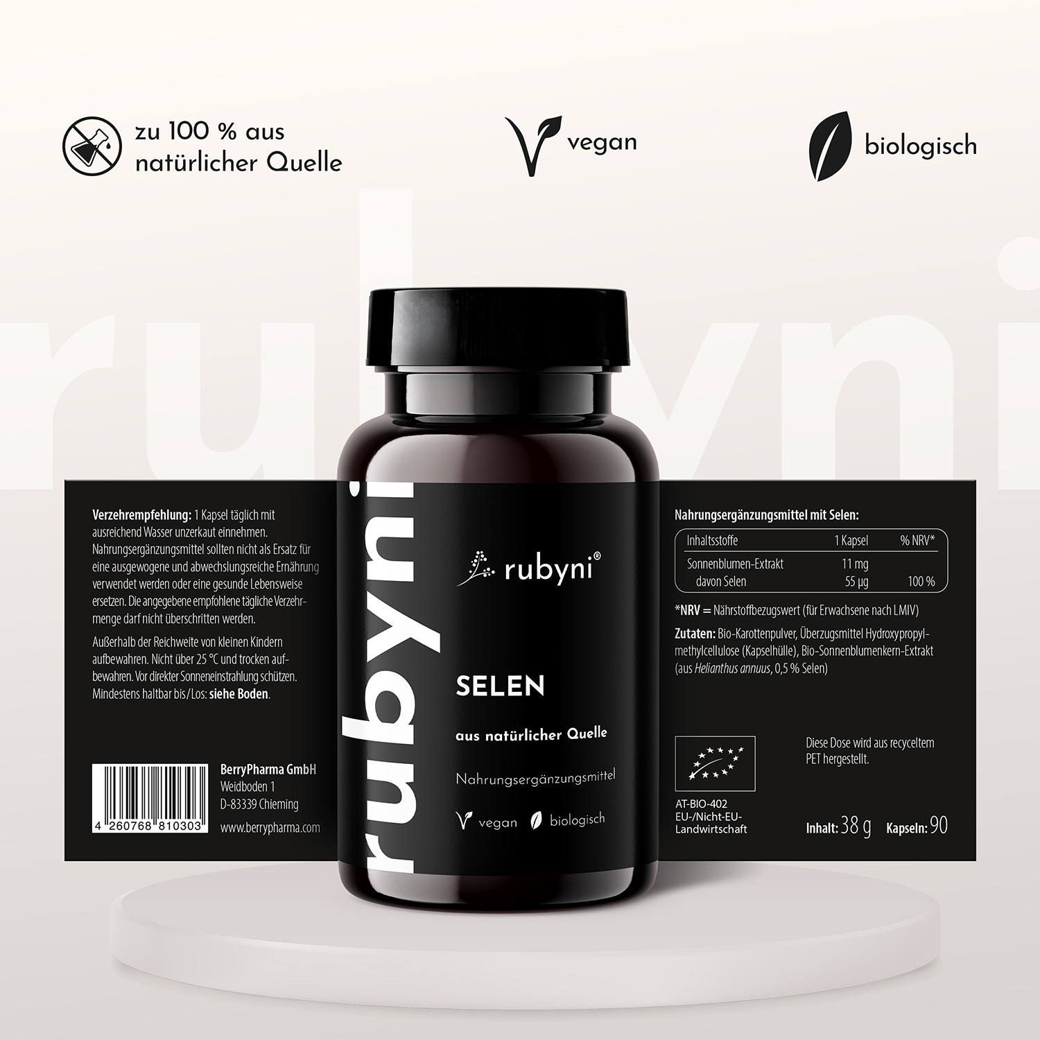 Ingredients: Organic carrot powder, organic sunflower seed extract (Helianthus annuus; 0.5% selenium). Coating agent: hydroxypropyl methylcellulose (plant-based capsule shell).
